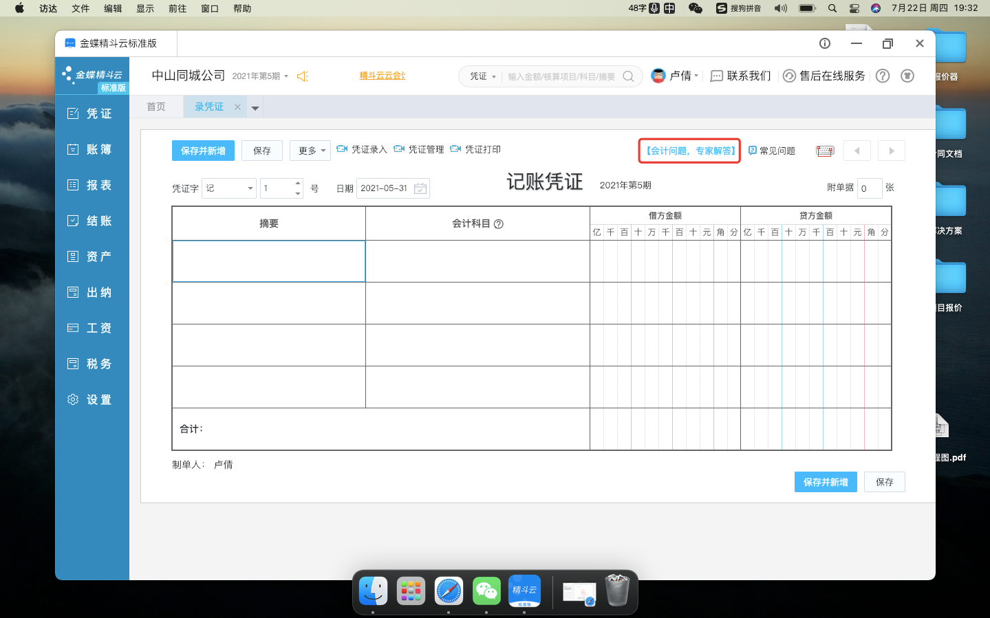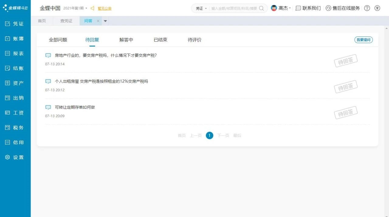 金蝶精斗云的迷你版、標準版產品,在錄憑證、查憑證、明細賬、科目余額表、結賬等財會最常使用的產品功能界面上提供【會計問題,專家解答】按鈕,用戶點擊按鈕即可一鍵發(fā)起提問。系統(tǒng)默認向新使用問答服務的賬套贈送3張問答卡。