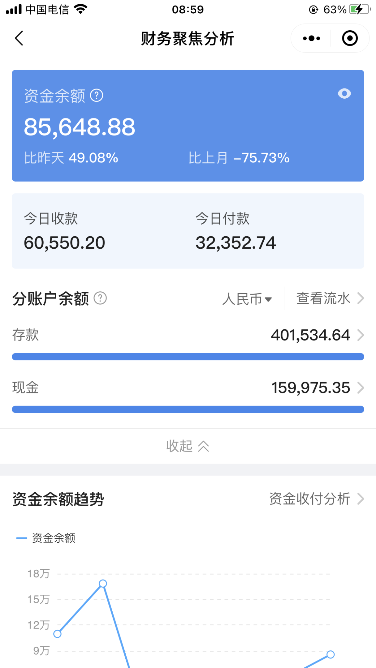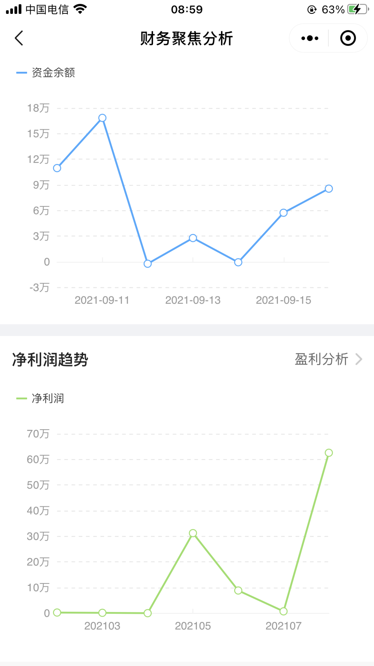 使用金蝶云·星辰后,英姐在微信上打開“老板參謀”小程序,就可以直觀的看到企業(yè)的資金余額和利潤分析,能實時了解企業(yè)資金的流向,每個賬號還剩多少錢,每個賬戶的流水明細情況,同時能對企業(yè)未來的資金情況進行預(yù)測。