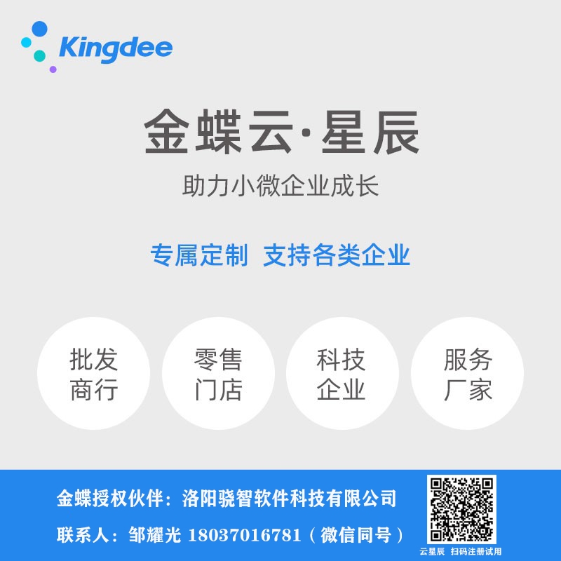 大家好,這里是“洛陽金蝶軟件,”洛陽驍智軟件科技有限公司,金蝶軟件洛陽地區(qū)授權(quán)“金牌”授權(quán)服務(wù)商,主營金蝶KIS云、金蝶云星空、金蝶云星辰、云會計、云進銷存、金蝶賬無憂、金蝶云之家、金蝶配套產(chǎn)品等金蝶ERP管理軟件。