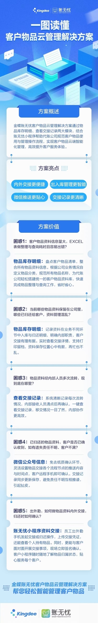 大家好,這里是“洛陽金蝶軟件”,洛陽驍智軟件科技有限公司,金蝶軟件授權“金牌”合作伙伴,金蝶賬無憂推出 客戶物品云管理解決方案,如下: