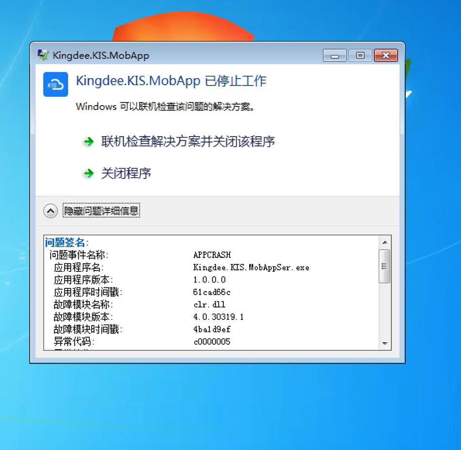 金蝶KIS云專業(yè)版,系統(tǒng)管理服務(wù)無法運(yùn)行,提示“Kingdee.KIS.MobAppSer.exe 已停止工作”