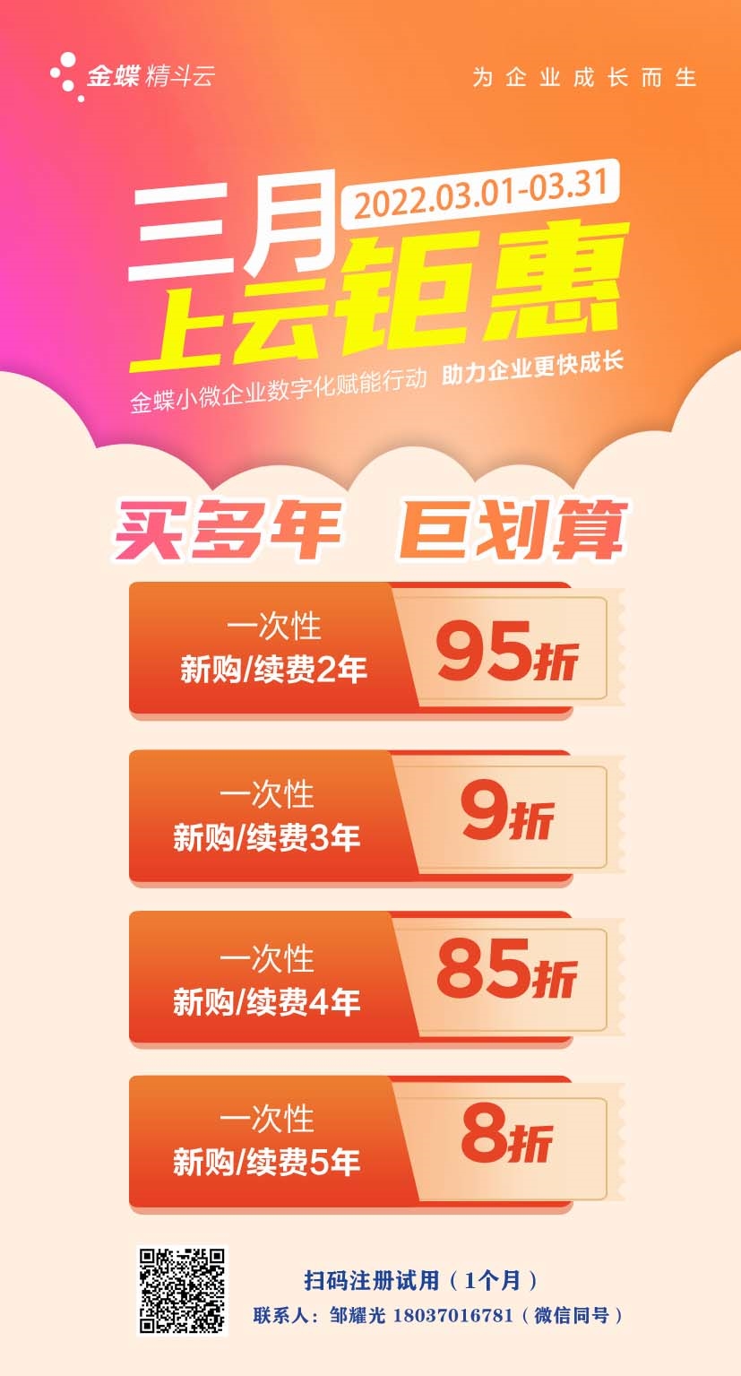 金蝶-云會計2022.3月開通購買 優惠政策如下: