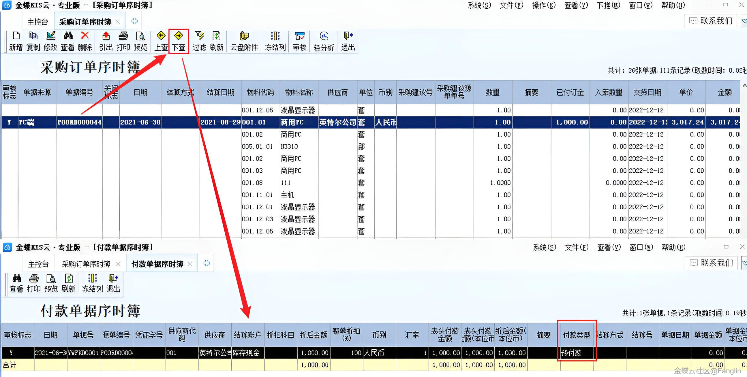 (6)采購/銷售訂單序時簿支持點擊【下查】查看關聯的預收預付單據