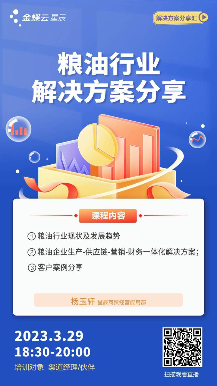 金蝶云星辰糧油行業解決方案分享課程包含: 1、糧油行業現狀及發展趨勢 2、糧油行業批發零售業財一體化解決方案 3、客戶案例分享