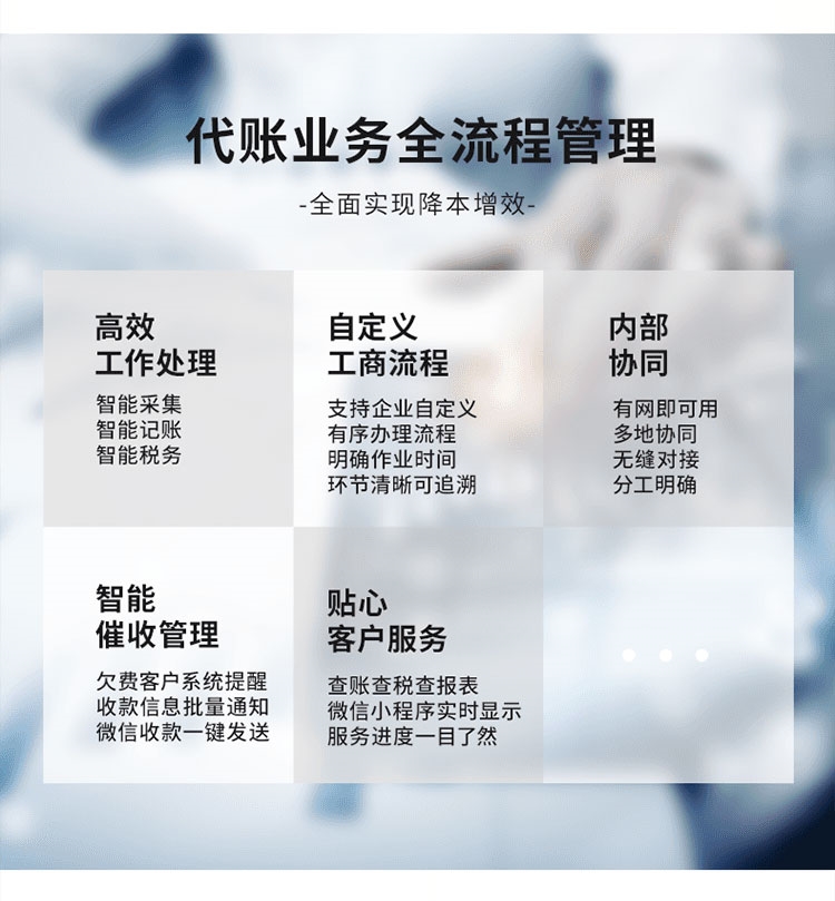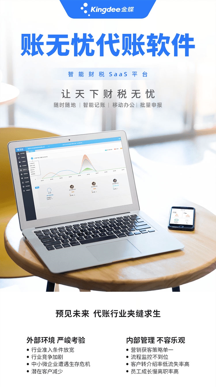 金蝶賬無憂是為財稅代賬公司量身定制的互聯網智能財稅SaaS平臺,由金蝶國際軟件集團傾力打造,依托金蝶28年的企業管理和精斗云14年的財務云服務經驗的累積,融合移動互聯網、大數據、AI智能、云計算新一代信息技術,以“一鍵無憂”為理念,助力代賬公司轉型升級,實現輕松代賬。